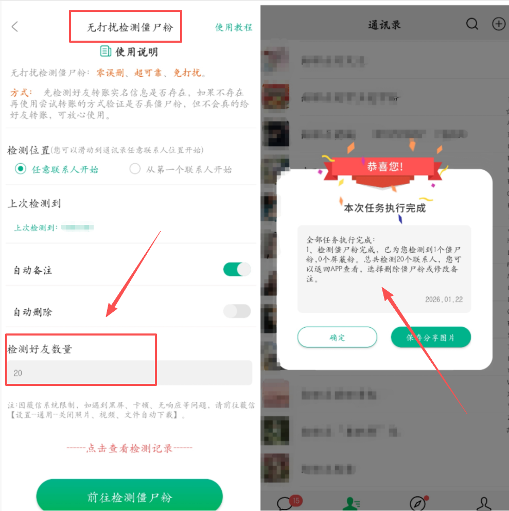 好友列表中存在大量已将你删除的人,不仅占用名额,还可能影响账号稳定性。里德助手Plus 的「无打扰检测僵尸粉」功能,可辅助识别已将您删除的联系人,全程无需群发消息或拉群,有效降低打扰风险,帮助您静默清理无效好友。